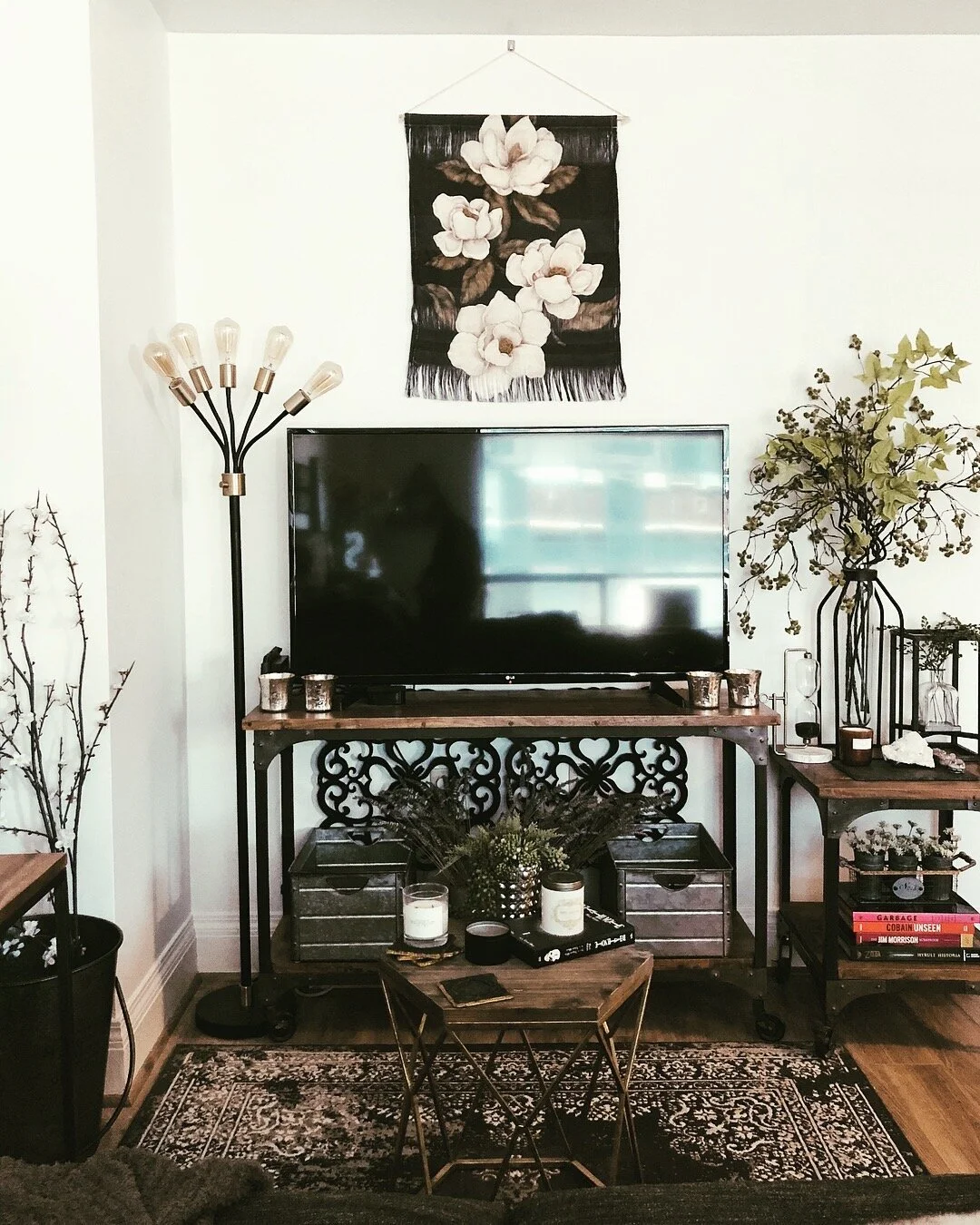 For example, I initially bought this magnolia wall hanging from Society6 for above my TV. And look how that turned out…