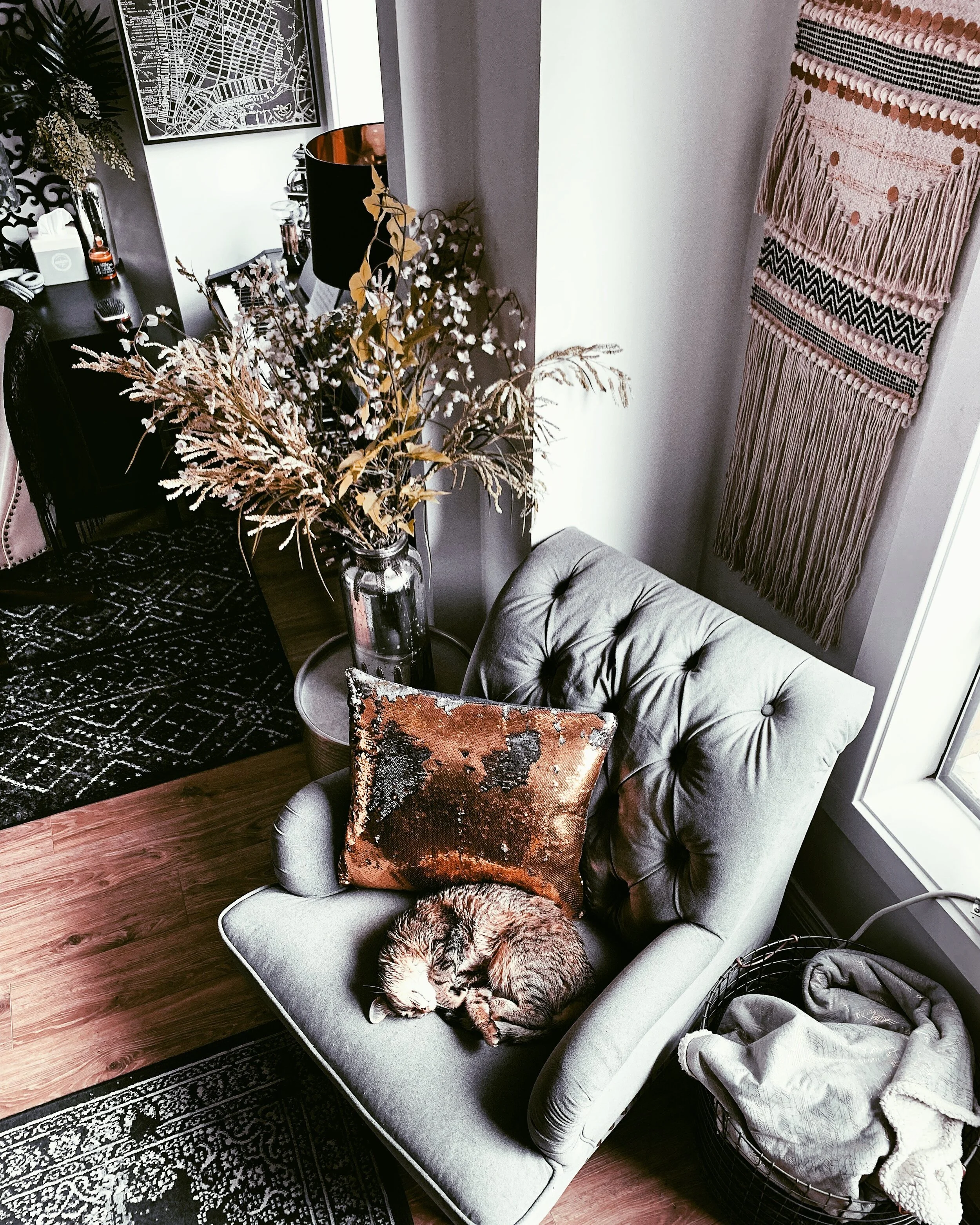 Currently my decor is funky and colorful. I'm moving to a bigger house where I will actually have a bedroom and I want to make my decor darker and cozier throughout the space. However, I don't want to have to get rid of everything I already have. Is there a right and wrong way to mix in some dark and make the space cozier without having to throw everything out? …I love your dark and cozy decor! It is so cohesive and I really would like to create a more cohesive look for my space.”