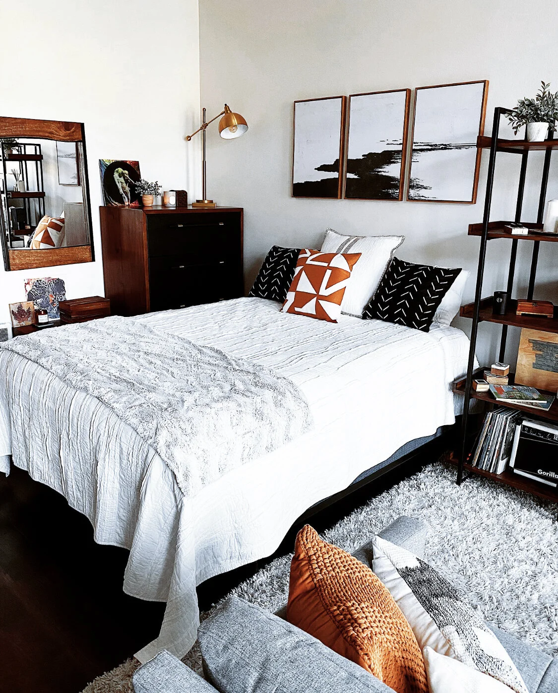 We went for kind of a cozy style, Scandinavian decor vibe, while also incorporating a little bit of a rock n roll style edge, and I’m so excited to share what we’ve done with the place! And of course, I also share my small apartment tips with you throughout the video so that you walk away with some nice studio apartment inspiration.